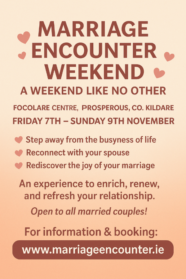Marriage Enrichment Weekend at The Focolare Centre, Curryhills, Prosperous, Co Kildare on 7-9 November 2025.