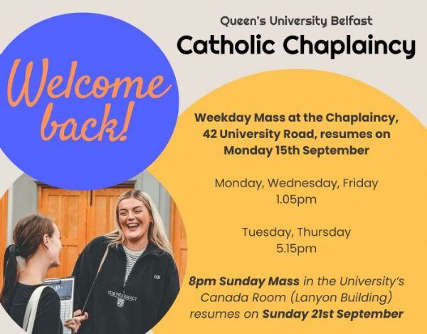 The Catholic Chaplaincy at Queen’s reopens on Monday 15 September at 42 University Road, with weekday Masses resuming and Sunday evening Mass back on 21 September at 8.00pm in the Canada Room, Lanyon Building.