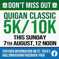 The Quigan Classic 5k / 10k Race starts on Sunday 7th August 2022 at 12 noon.