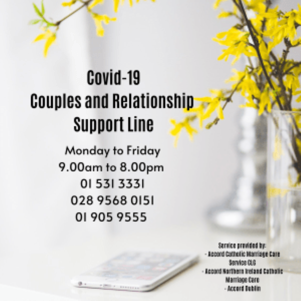 Mary Johnston, a specialist in counselling (marriage and relationships), with Accord Catholic Marriage Care CLG, said, "Accord is very conscious of those experiencing difficulties in their relationships and family lives as we are confined to home during this unprecedented period for all in society. The circumstances in which we are living now can increase stress and pressure on relationships and in families. To help address these challenges, Accord has established a relationship support phone line to enable callers to speak to experienced couples and relationship counsellors in order to talk through the difficulties they are experiencing”.