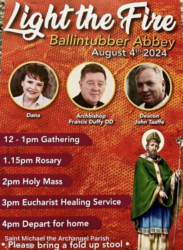 Mass, rosary, praise, adoration & healing service. Sunday Aug 4 noon - 4pm. Details: www.lightthefire.ie