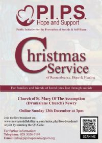 PIPS (Public Initiative for the Prevention of Suicide) Hope & Support (Newry) will broadcast their annual Christmas Service of Remembrance, Hope & Healing from the Church of the Assumption, Drumalane (Middle Killeavy) on Sunday 13th December at 3pm (link: http://www.newrymiddlekilleavy.com/index.php/live-broadcast/).