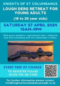 Do you want to explore your faith with other like-minded young people in a beautiful and reflective location? Join us for a Retreat for Young Adults at Lough Derg, Pettigo, County Donegal on Saturday, 27th April 2024 from 10am to 4pm. Refreshments and Lunch provided.