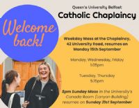 The Catholic Chaplaincy at Queen’s reopens on Monday 15 September at 42 University Road, with weekday Masses resuming and Sunday evening Mass back on 21 September at 8.00pm in the Canada Room, Lanyon Building.