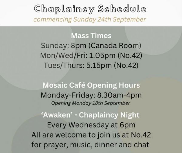 There you will find a Chapel, social space and our much-loved Mosaic Café, open 8.30am to 8.30pm weekdays during term. Sunday Masses take place at 8pm in the Canada Room of the University’s Lanyon Building (from Sunday 24 September) and weekday Masses in the Chaplaincy at No.42 (from Monday 25 September).