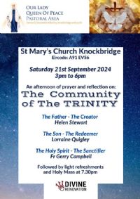 An afternoon of Prayer and reflection on the three persons of the Holy Trinity: The Father, The Son, The Holy Spirit. This will take place in St. Mary’s Church, Knockbridge on Saturday 21st September from 3pm to 6pm.