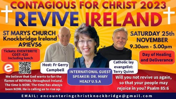 Encountering Christ Ministries are pleased to announce that international guest speaker Dr Mary Healy, USA, is coming to Ireland and will be in Knockbridge, Co Louth to join with Fr Gerry Campbell, and Catholic Lay Evangelist Terry Quinn for the 3rd Annual Contagious for Christ Conferences. St Mary’s Church A91 EV56.