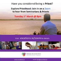 On Tuesday, 1st March @ 8pm there will be an opportunity for young men to join in on Zoom to find out more about priesthood and to hear directly from two young men who are currently studying for the priesthood in our National Seminary in Maynooth. The event is being run by the National Vocations Office.