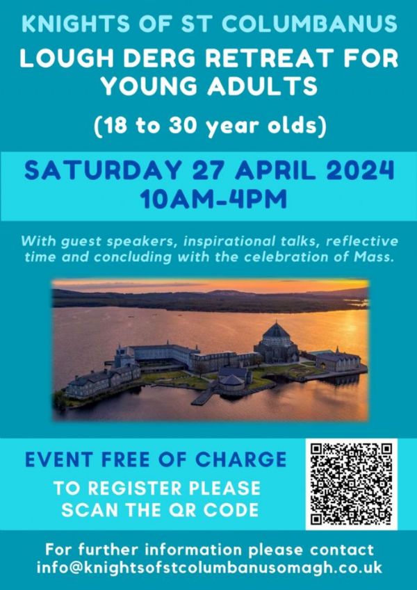 Do you want to explore your faith with other like-minded young people in a beautiful and reflective location? Join us for a Retreat for Young Adults at Lough Derg, Pettigo, County Donegal on Saturday, 27th April 2024 from 10am to 4pm. Refreshments and Lunch provided.