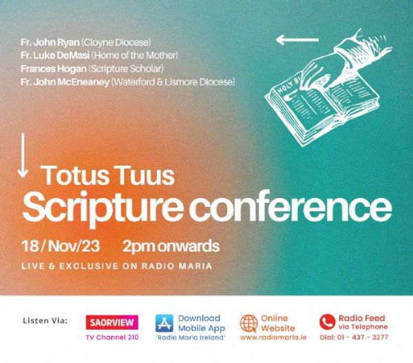Totus Tuus Scripture Conference 2023 is live on Radio Maria Ireland on Saturday, 18th November from 2pm.