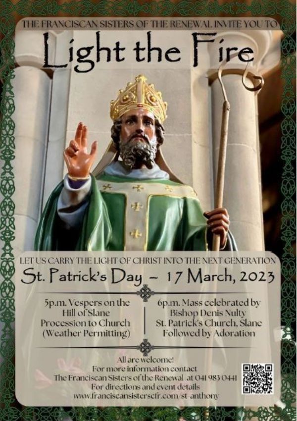 LIGHT THE FIRE 2023 – The Franciscan Sisters of the Renewal invite you to join us in Slane on St. Patrick’s Day at 5:00 p.m. Vespers on the Hill of Slane and Rosary procession to the Church, 6:00 p.m Mass in St. Patrick’s Church followed by Eucharistic Adoration. Main celebrant: Bishop Denis Nulty.